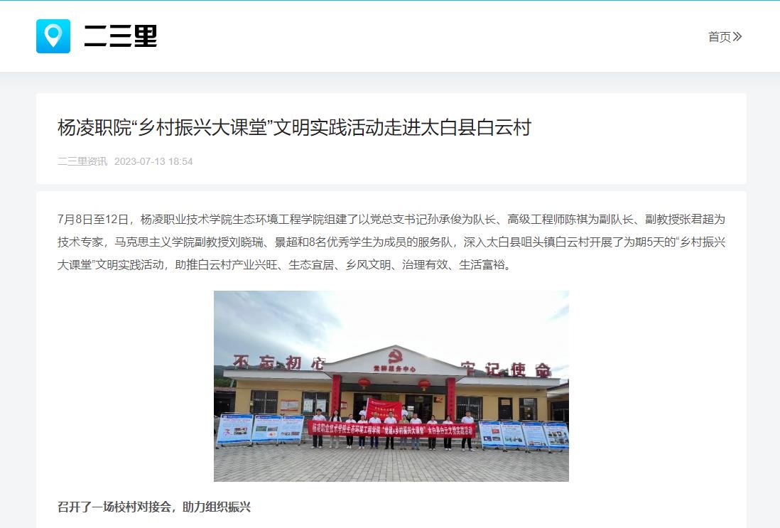 7月8日至12日,杨凌职业技术学院生态环境工程学院组建了以党总支书记孙承俊为队长、高级工程师陈祺为副队长、副教授张君超为技术专家,马克思主义学院副教授刘晓瑞、景超和8名优秀学生为成员的服务队,深入太白县咀头镇白云村开展了为期5天的“乡村振兴大课堂”文明实践活动,助推白云村产业兴旺、生态宜居、乡风文明、治理有效、生活富裕。