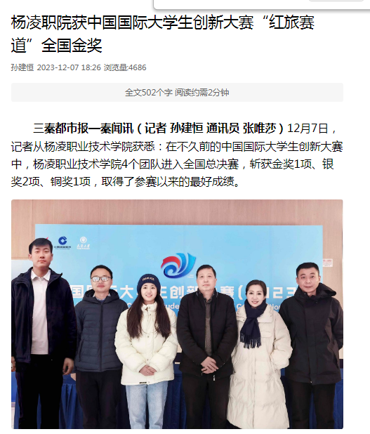 【三秦都市报】杨凌职院获中国国际大学生创新大赛“红旅赛道”全国金奖