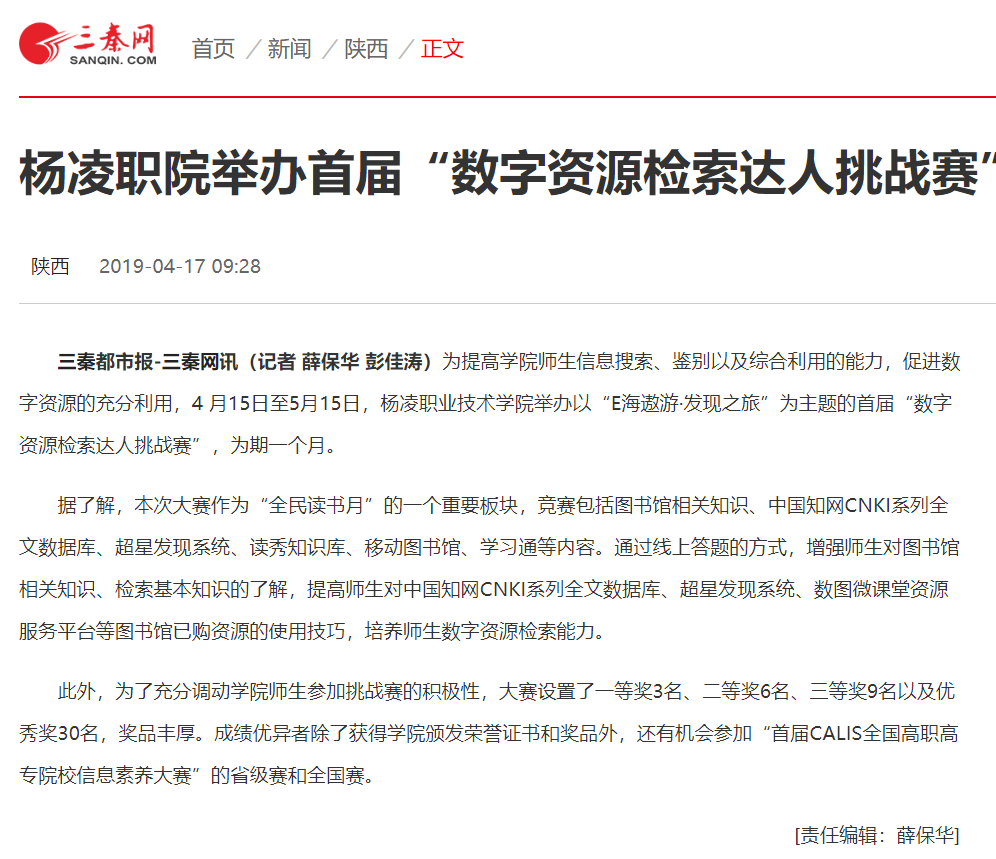 三秦都市报-三秦网讯(记者 薛保华 彭佳涛)为提高学院师生信息搜索、鉴别以及综合利用的能力,促进数字资源的充分利用,4 月15日至5月15日,杨凌职业技术学院举办以“E海遨游·发现之旅”为主题的首届“数字资源检索达人挑战赛”,为期一个月。