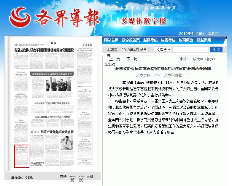 【各界导报】全国政协委员霍学喜应邀到杨凌职院宣讲全国两会精神