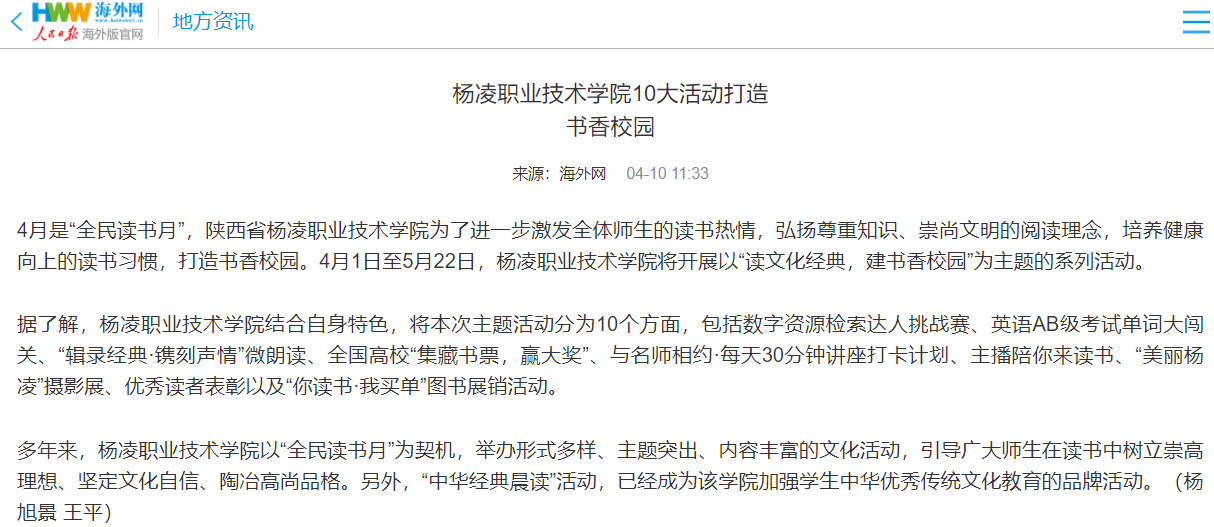 4月是“全民读书月”,陕西省杨凌职业技术学院为了进一步激发全体师生的读书热情,弘扬尊重知识、崇尚文明的阅读理念,培养健康向上的读书习惯,打造书香校园。4月1日至5月22日,杨凌职业技术学院将开展以“读文化经典,建书香校园”为主题的系列活动。