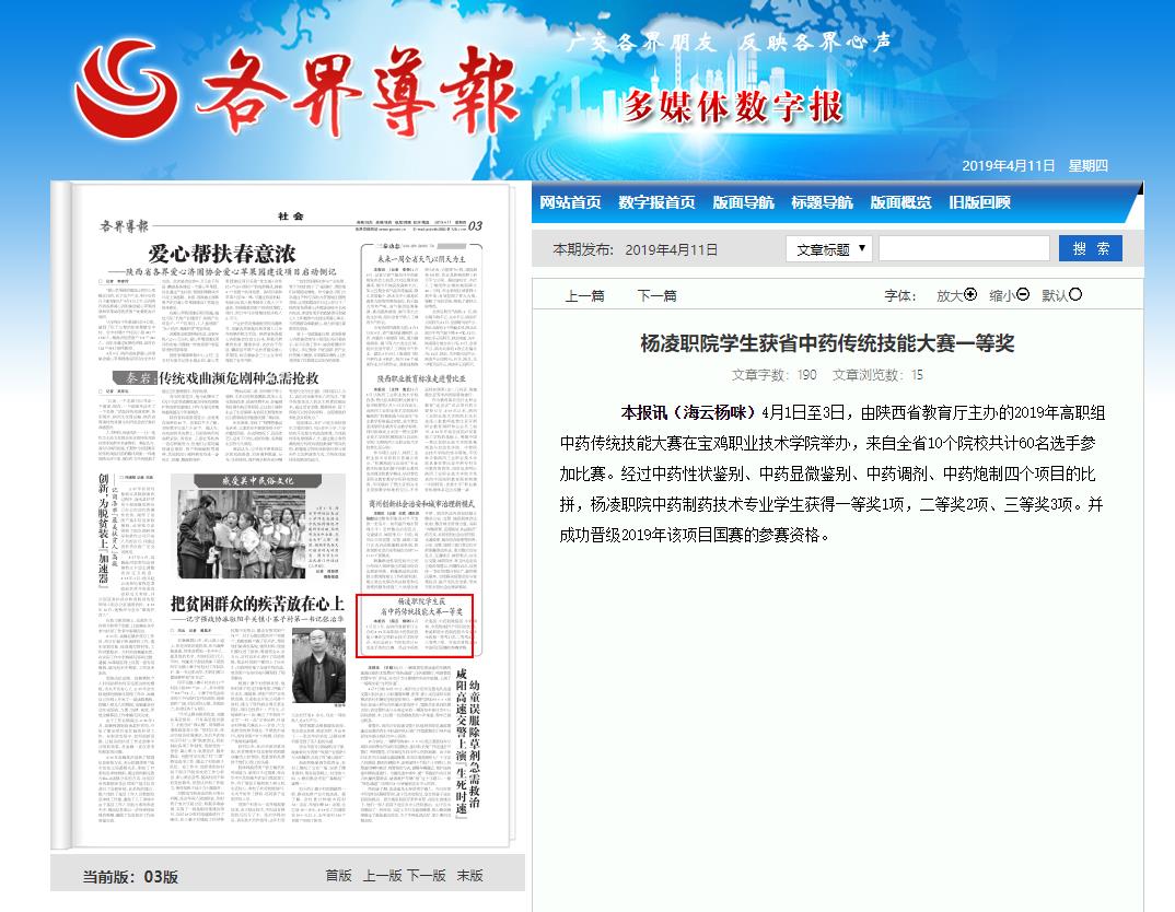 本报讯(海云杨咪)4月1日至3日,由陕西省教育厅主办的2019年高职组中药传统技能大赛在宝鸡职业技术学院举办,来自全省10个院校共计60名选手参加比赛。经过中药性状鉴别、中药显微鉴别、中药调剂、中药炮制四个项目的比拼,杨凌职院中药制药技术专业学生获得一等奖1项,二等奖2项、三等奖3项。并成功晋级2019年该项目国赛的参赛资格。