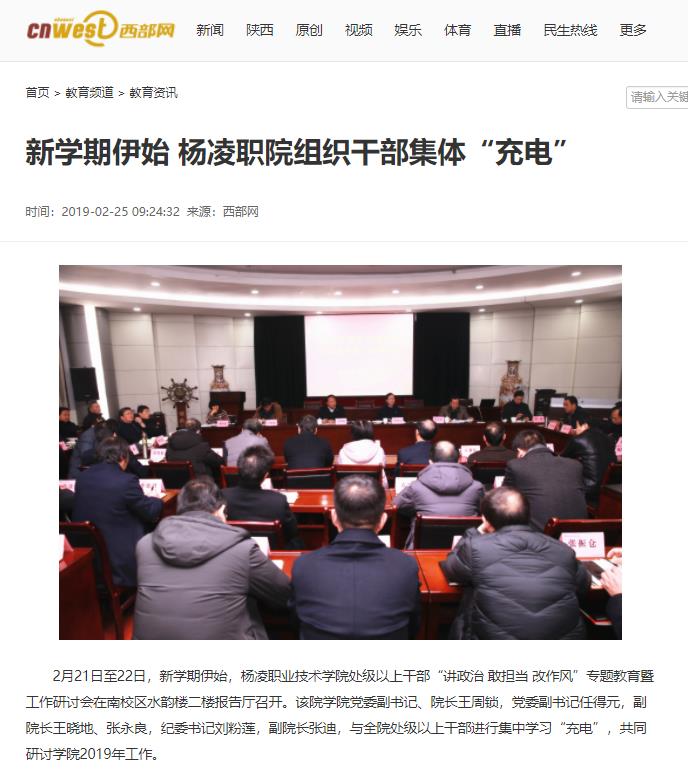 2月21日至22日,新学期伊始,杨凌职业技术学院处级以上干部“讲政治 敢担当 改作风”专题教育暨工作研讨会在南校区水韵楼二楼报告厅召开。该院学院党委副书记、院长王周锁,党委副书记任得元,副院长王晓地、张永良,纪委书记刘粉莲,副院长张迪,与全院处级以上干部进行集中学习“充电”,共同研讨学院2019年工作。