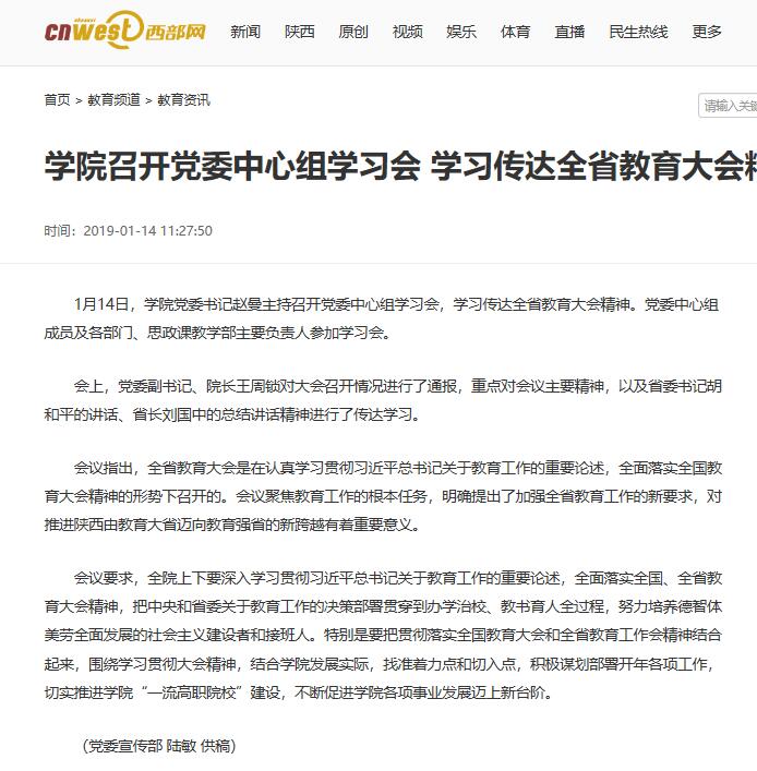 1月14日,学院党委书记赵曼主持召开党委中心组学习会,学习传达全省教育大会精神。党委中心组成员及各部门、思政课教学部主要负责人参加学习会。
