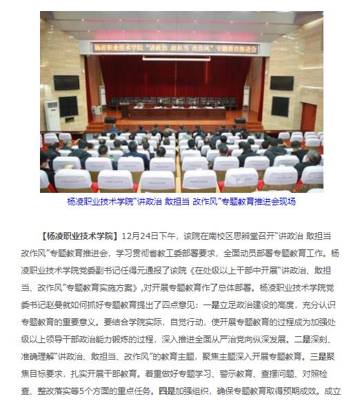 【杨凌职业技术学院】12月24日下午,该院在南校区思辨堂召开“讲政治 敢担当 改作风”专题教育推进会,学习贯彻省教工委部署要求,全面动员部署专题教育工作。杨凌职业技术学院党委副书记任得元通报了该院《在处级以上干部中开展“讲政治、敢担当、改作风”专题教育实施方案》,对开展专题教育作了总体部署。杨凌职业技术学院党委书记赵曼就如何抓好专题教育提出了四点意见:一是立足政治建设的高度,充分认识专题教育的重要意义。要结合学院实际,自觉行动,使开展专题教育的过程成为加强处级以上领导干部政治能力锻炼的过程,深入推进全面从严治党向纵深发展。二是深刻、准确理解“讲政治、敢担当、改作风”的教育主题,聚焦主题深入开展专题教育。三是聚焦目标要求,扎实开展干部教育。着重做好专题学习、警示教育、查摆问题、对照检查、整改落实等5个方面的重点任务。四是加强组织,确保专题教育取得预期成效。成立专题教育领导小组,制定实施方案,进一步明确相关职能部门的职责任务,以及对处级以上领导干部的要求。赵曼强调,要积极行动起来,按照专题教育的部署,坚持政治引领、坚持问题导向、坚持从严从实、坚持以上率下,学在前、做在先,切实解决自身存在的问题。突出提高站位讲政治,突出尽职尽责敢担当,突出干净干事改作风,确保专题教育扎扎实实取得成效。要团结一致、齐心协力,以专题教育为契机,把“讲政治、敢担当、改作风”专题教育的成效转化为加快学院发展的强劲动力,推动学院在新时代追赶超越有新气象、新作为,为实现建成“国内一流,具有一定国际影响力”的高职名校目标而努力奋斗。杨凌职业技术学院党委副书记、院长王周锁在主持会议时强调,一是充分认识开展专题教育的背景。二是做好专题教育的学习传达。要站在讲政治的高度,牢固树立“四个意识”,坚决做到“两个维护”。三是敢担当、转作风,坚定不移地推进党风廉政建设,为学院可持续发展锻炼培养堪当重任、师生信任的领导干部队伍。该院领导及副处级以上干部参加会议。