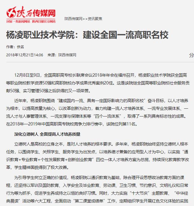 12月8日至9日,全国高职高专校长联席会议2018年年会在福州召开,杨凌职业技术学院获全国高等职业院校教学资源50强和高职院校办学成果优秀案例20佳。这是该院继全国高等职业院校社会服务贡献50强、实习管理50强之后获得的又一项荣誉。