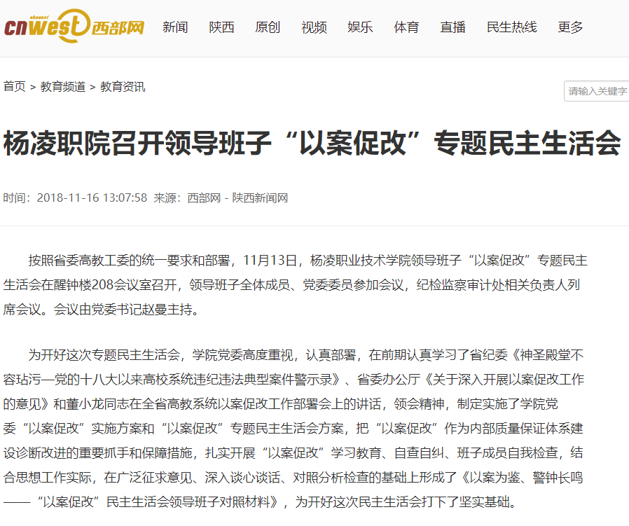 【西部网】杨凌职院召开领导班子“以案促改”专题民主生活会
