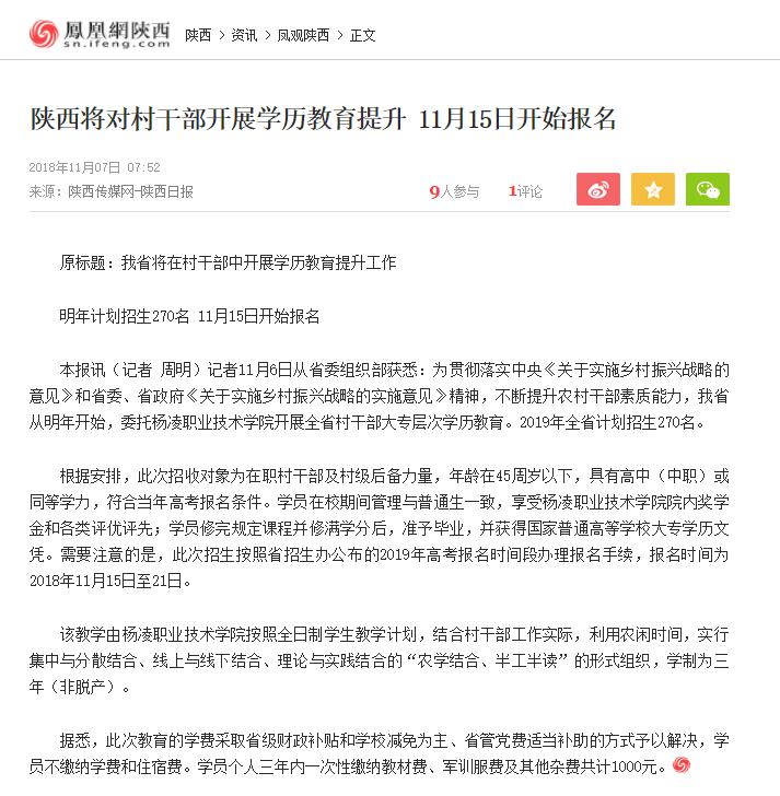 【凤凰网】陕西将对村干部开展学历教育提升 11月15日开始报名