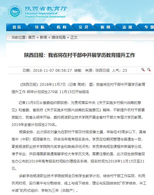 记者116日从省委组织部获悉:为贯彻落实中央《关于实施乡村振兴战略的意见》和省委、省政府《关于实施乡村振兴战略的实施意见》精神,不断提升农村干部素质能力,我省从明年开始,委托杨凌职业技术学院开展全省村干部大专层次学历教育。2019年全省计划招生270名。