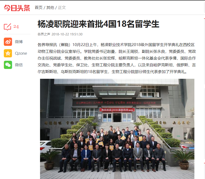 各界导报讯(崔晓)10月22日上午,杨凌职业技术学院2018级外国留学生开学典礼在西校区动物工程分院会议室举行。学院党委书记赵曼,院长王周锁,副院长张永良,党委委员、党政办主任祝战斌,党委委员、教务处处长张宏辉,哈斯克斯坦一体化基金会代表李倩,国际合作交流处、党委学生处、保卫处、生物工程分院主要负责人,以及来自哈萨克斯坦、俄罗斯、吉尔吉斯斯坦、乌斯别克斯坦的18名留学生,生物工程分院部分师生代表参加了开学典礼。