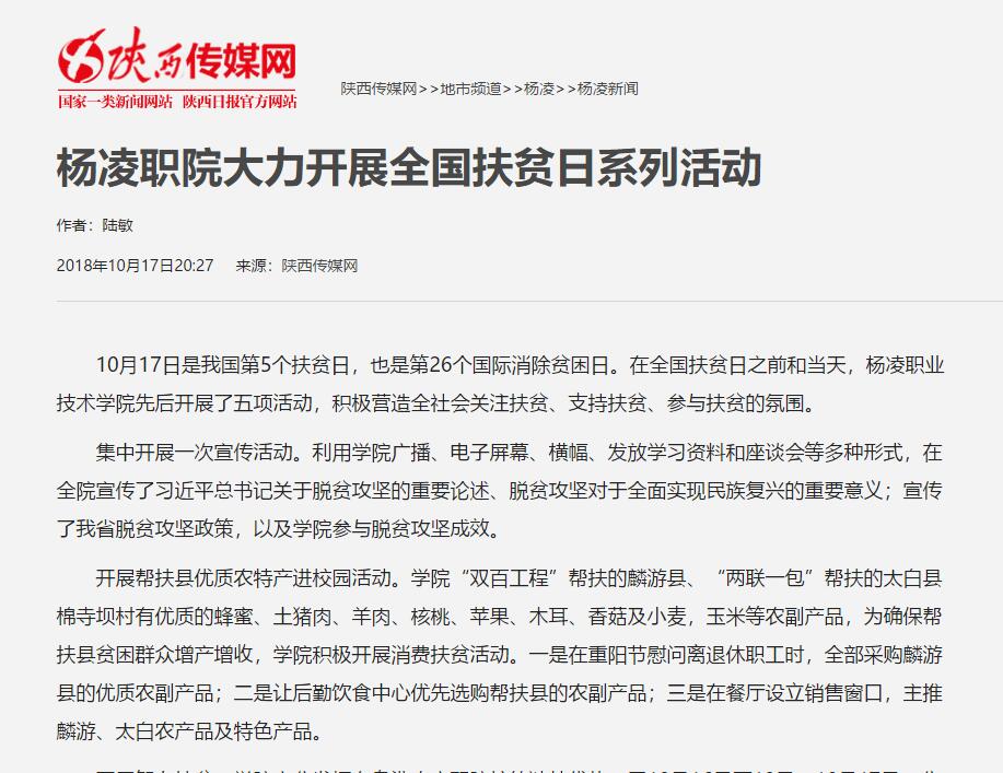 10月17日是我国第5个扶贫日,也是第26个国际消除贫困日。在全国扶贫日之前和当天,杨凌职业技术学院先后开展了五项活动,积极营造全社会关注扶贫、支持扶贫、参与扶贫的氛围。