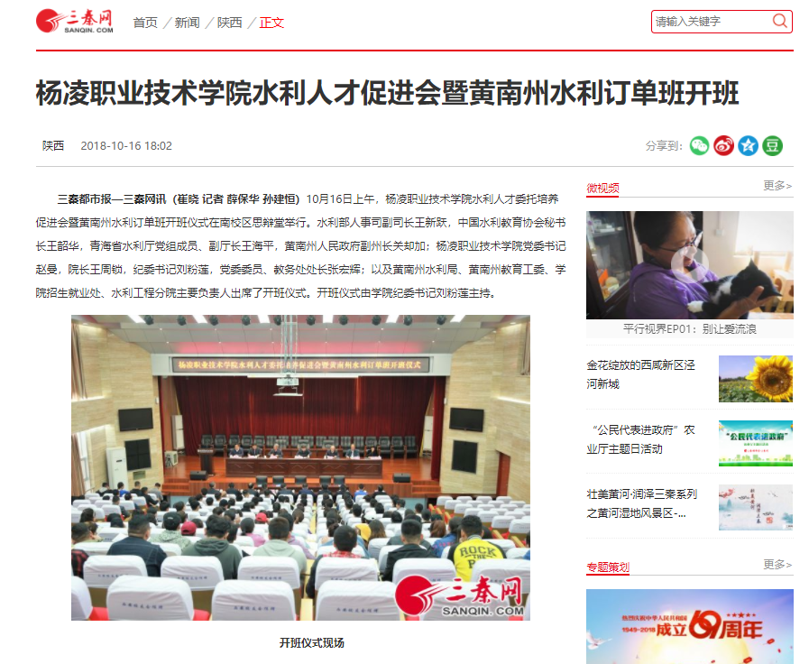 三秦都市报—三秦网讯(崔晓 记者 薛保华 孙建恒)10月16日上午,杨凌职业技术学院水利人才委托培养促进会暨黄南州水利订单班开班仪式在南校区思辩堂举行。水利部人事司副司长王新跃,中国水利教育协会秘书长王韶华,青海省水利厅党组成员、副厅长王海平,黄南州人民政府副州长关却加;杨凌职业技术学院党委书记赵曼,院长王周锁,纪委书记刘粉莲,党委委员、教务处处长张宏辉;以及黄南州水利局、黄南州教育工委、学院招生就业处、水利工程分院主要负责人出席了开班仪式。开班仪式由学院纪委书记刘粉莲主持。