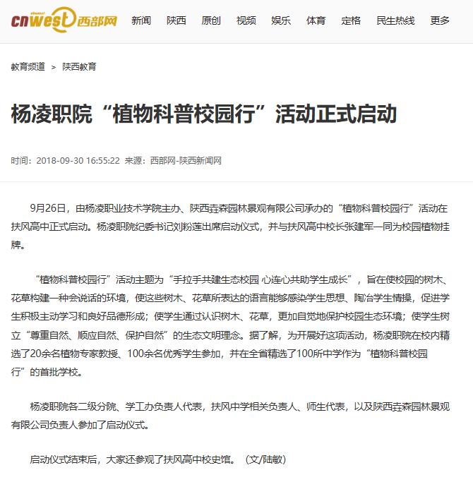9月26日,由杨凌职业技术学院主办、陕西垚森园林景观有限公司承办的“植物科普校园行”活动在扶风高中正式启动。杨凌职院纪委书记刘粉莲出席启动仪式,并与扶风高中校长张建军一同为校园植物挂牌。