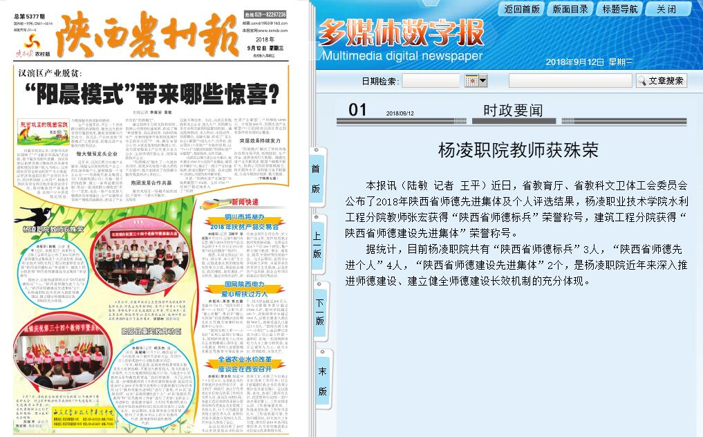 本报讯(陆敏 记者 王平)近日,省教育厅、省教科文卫体工会委员会公布了2018年陕西省师德先进集体及个人评选结果,杨凌职业技术学院水利工程分院教师张宏获得“陕西省师德标兵”荣誉称号,建筑工程分院获得“陕西省师德建设先进集体”荣誉称号。