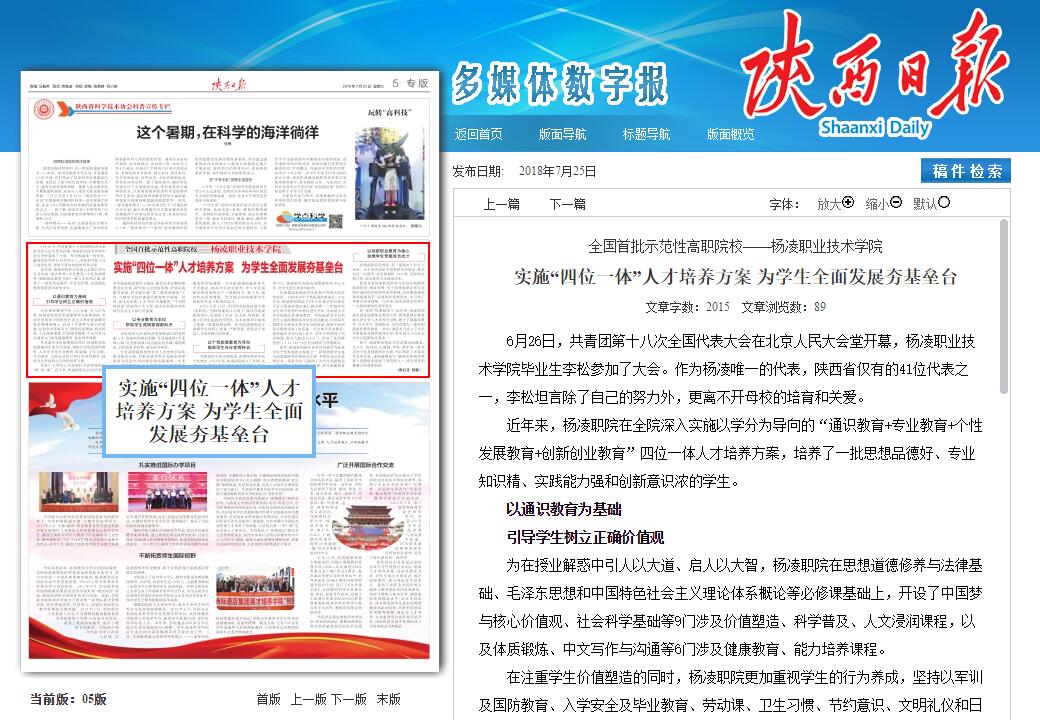 近年来,杨凌职院在全院深入实施以学分为导向的“通识教育+专业教育+个性发展教育+创新创业教育”四位一体人才培养方案,培养了一批思想品德好、专业知识精、实践能力强和创新意识浓的学生。