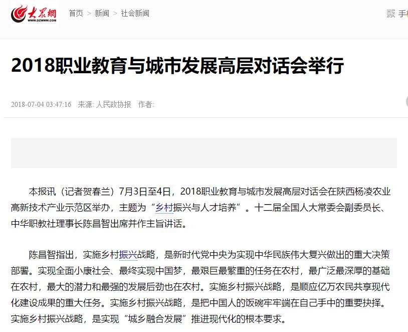 本报讯(记者贺春兰)7月3日至4日,2018职业教育与城市发展高层对话会在陕西杨凌农业高新技术产业示范区举办,主题为“乡村振兴与人才培养”。十二届全国人大常委会副委员长、中华职教社理事长陈昌智出席并作主旨讲话。