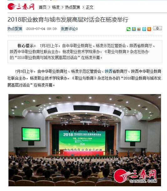 7月3日上午,由中华职业教育社、杨凌示范区管委会、陕西省教育厅、陕西中华职业教育社联合主办,杨凌职业技术学院承办,《职业与教育》杂志社协办的“2018职业教育与城市发展高层对话会”在杨凌开幕。