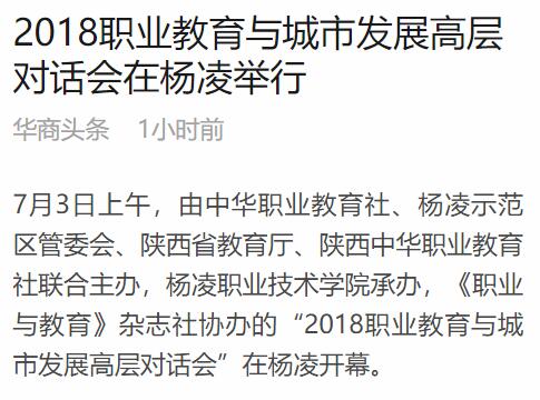 7月3日上午,由中华职业教育社、杨凌示范区管委会、陕西省教育厅、陕西中华职业教育社联合主办,杨凌职业技术学院承办,《职业与教育》杂志社协办的“2018职业教育与城市发展高层对话会”在杨凌开幕。