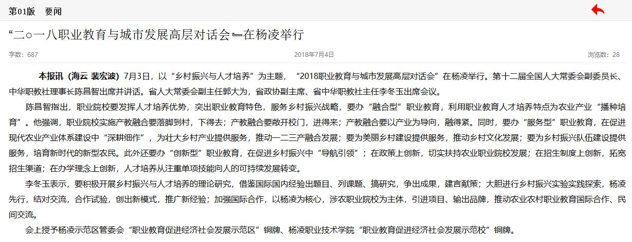 本报讯(海云 裴红波)7月3日,以“乡村振兴与人才培养”为主题,“2018职业教育与城市发展高层对话会”在杨凌举行。第十二届全国人大常委会副委员长、中华职教社理事长陈昌智出席并讲话。省人大常委会副主任郭大为,省政协副主席、省中华职教社主任李冬玉出席会议。