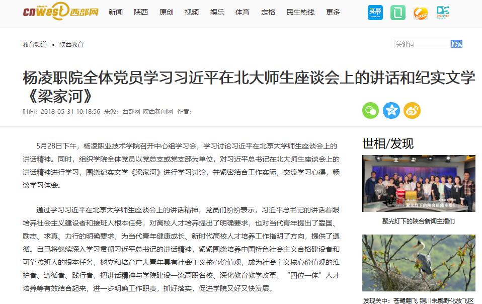 5月28日下午,杨凌职业技术学院召开中心组学习会,学习讨论习近平在北京大学师生座谈会上的讲话精神。同时,组织学院全体党员以党总支或党支部为单位,对习近平总书记在北大师生座谈会上的讲话精神进行学习,围绕纪实文学《梁家河》进行学习讨论,并紧密结合工作实际,交流学习心得,畅谈学习体会。