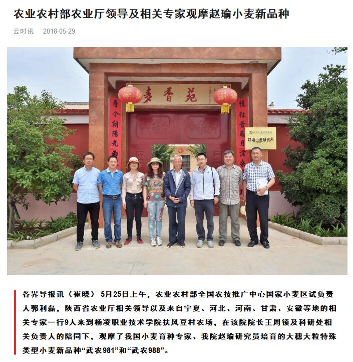 各界导报讯(崔晓) 5月25日上午,农业农村部全国农技推广中心国家小麦区试负责人郭利磊,陕西省农业厅相关领导以及来自宁夏、河北、河南、甘肃、安徽等地的相关专家一行9人来到杨凌职业技术学院扶风豆村农场,在该院院长王周锁及科研处相关负责人的陪同下,观摩了我国小麦育种专家、我院赵瑜研究员培育的大穗大粒特殊类型小麦新品种“武农981”和“武农988”。