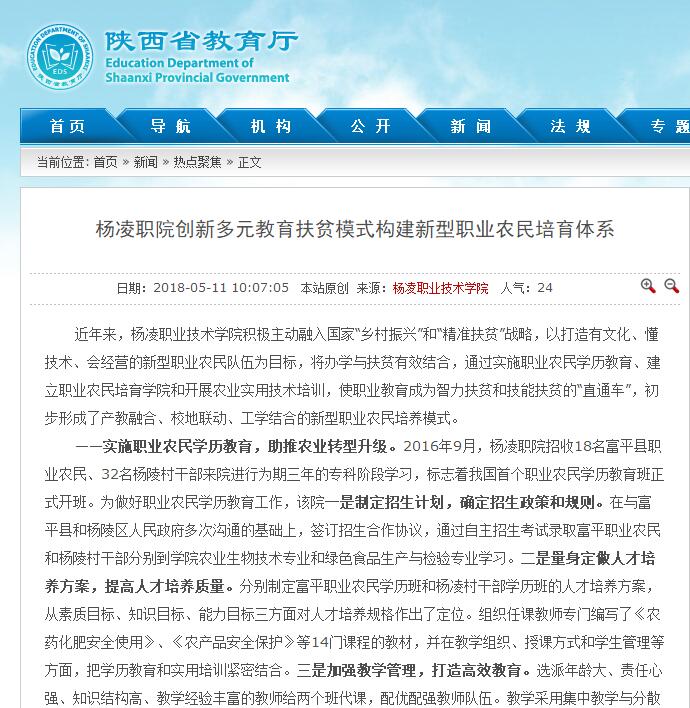 【陕西省教育厅】热点聚焦:杨凌职院创新多元教育扶贫模式构建新型职业农民培育体系