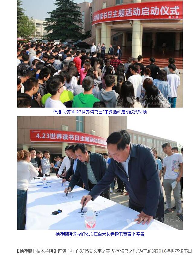 【杨凌职业技术学院】该院举办了以“感受文字之美 尽享读书之乐”为主题的2018年世界读书日活动启动仪式,该院院长王周锁出席启动仪式并讲话、副院长张永良宣读2017年度最美读者表彰决定。仪式上,王周锁指出,作为高职院校,教书育人是学院的重点工作,近年来,学院在鼓励读书、提倡读书、开展全民阅读活动方面做了大量的工作,尤其是学院组织倡导的“经典晨读”及其系列活动,带动了同学们学习传承中华优秀传统文化的热情。今天举办这次“读书日”活动,希望全体师生读者能积极参与到本次读书日活动中来,进一步激发全院师生读书的兴趣,营造浓厚的读书氛围,养成良好的读书习惯,提高师生的审美修养和人文底蕴,促进师生全面健康、可持续发展。张永良宣读了《关于表彰2017年度“最美读者”的通知》。启动仪式结束后,该院领导们依次在百米长卷读书宣言上签字,传播读书热情。