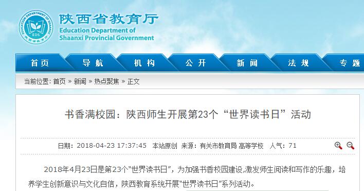 2018年4月23日是第23个“世界读书日”,为加强书香校园建设,激发师生阅读和写作的乐趣,培养学生创新意识与文化自信,陕西教育系统开展“世界读书日”系列活动。
