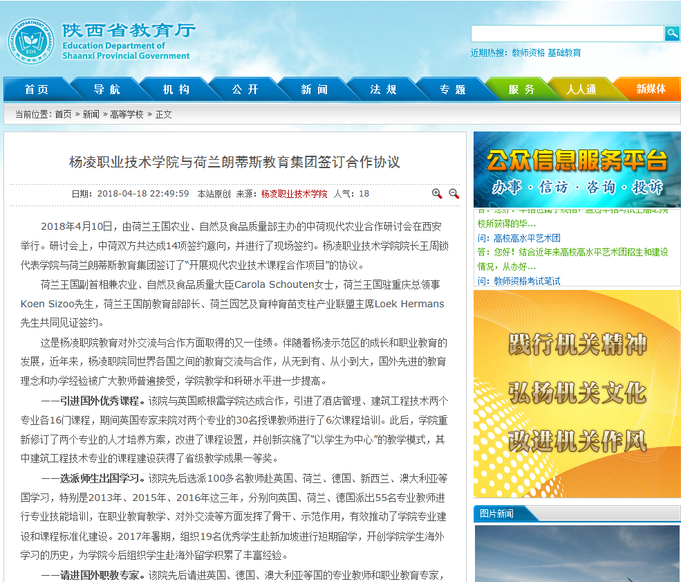 2018年4月10日,由荷兰王国农业、自然及食品质量部主办的中荷现代农业合作研讨会在西安举行。研讨会上,中荷双方共达成14项签约意向,并进行了现场签约。杨凌职业技术学院院长王周锁代表学院与荷兰朗蒂斯教育集团签订了“开展现代农业技术课程合作项目”的协议。