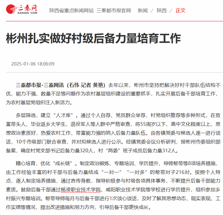 三秦都市报-三秦网讯(石伟 记者 黄艳)去年以来,彬州市坚持把解决好村干部队伍结构不优、能力不强、数量不足等问题作为农村基层组织建设的重要抓手,扎实开展后备干部培育工作,为农村基层党组织注入新活力。