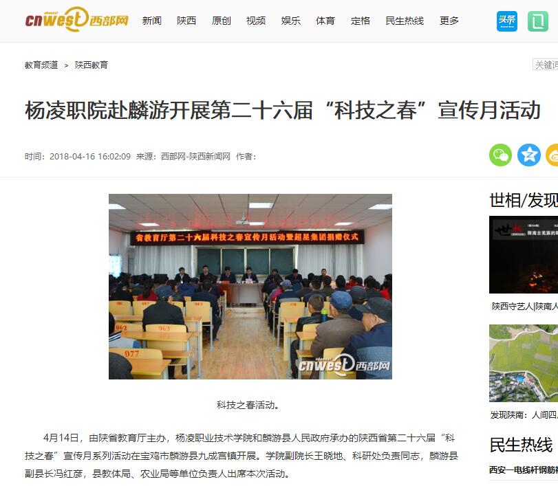 4月14日,由陕省教育厅主办,杨凌职业技术学院和麟游县人民政府承办的陕西省第二十六届“科技之春”宣传月系列活动在宝鸡市麟游县九成宫镇开展。学院副院长王晓地、科研处负责同志,麟游县副县长冯红彦,县教体局、农业局等单位负责人出席本次活动。