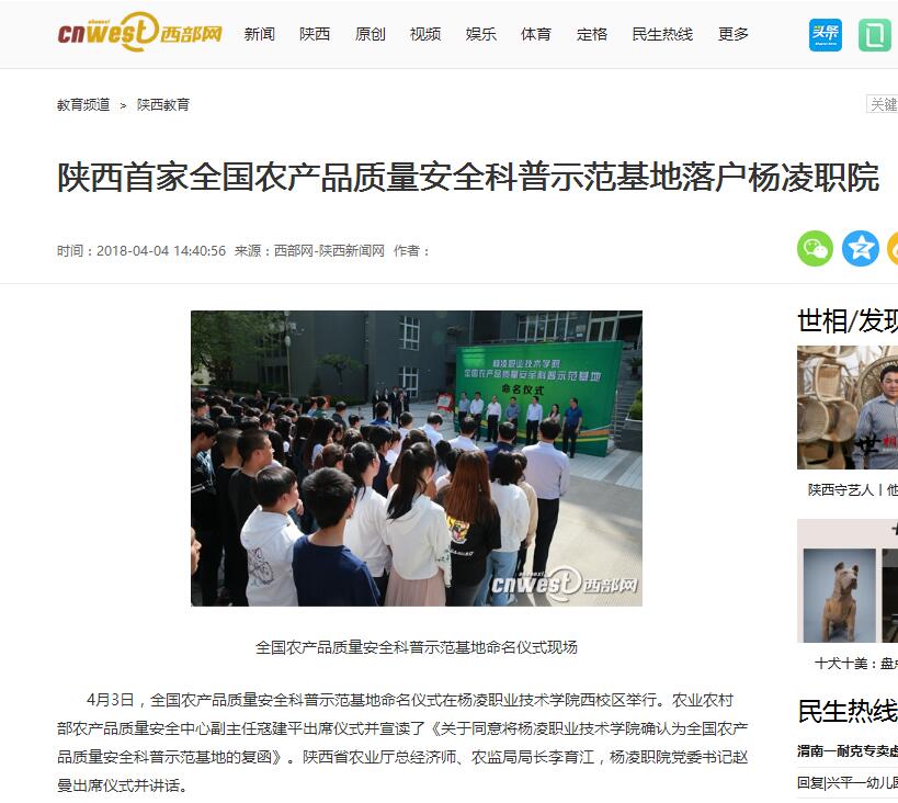 4月3日,全国农产品质量安全科普示范基地命名仪式在杨凌职业技术学院西校区举行。农业农村部农产品质量安全中心副主任寇建平出席仪式并宣读了《关于同意将杨凌职业技术学院确认为全国农产品质量安全科普示范基地的复函》。陕西省农业厅总经济师、农监局局长李育江,杨凌职院党委书记赵曼出席仪式并讲话。