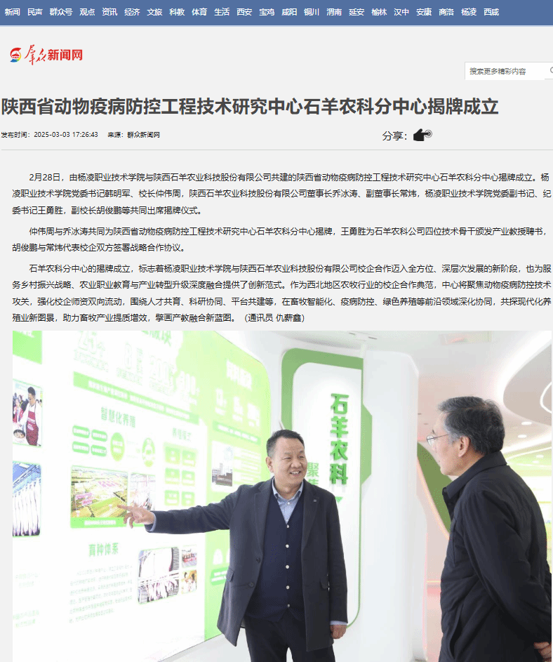 2月28日,由杨凌职业技术学院与陕西石羊农业科技股份有限公司共建的陕西省动物疫病防控工程技术研究中心石羊农科分中心揭牌成立。杨凌职业技术学院党委书记韩明军、校长仲伟周,陕西石羊农业科技股份有限公司董事长乔冰涛、副董事长常炜,杨凌职业技术学院党委副书记、纪委书记王勇胜,副校长胡俊鹏等共同出席揭牌仪式。