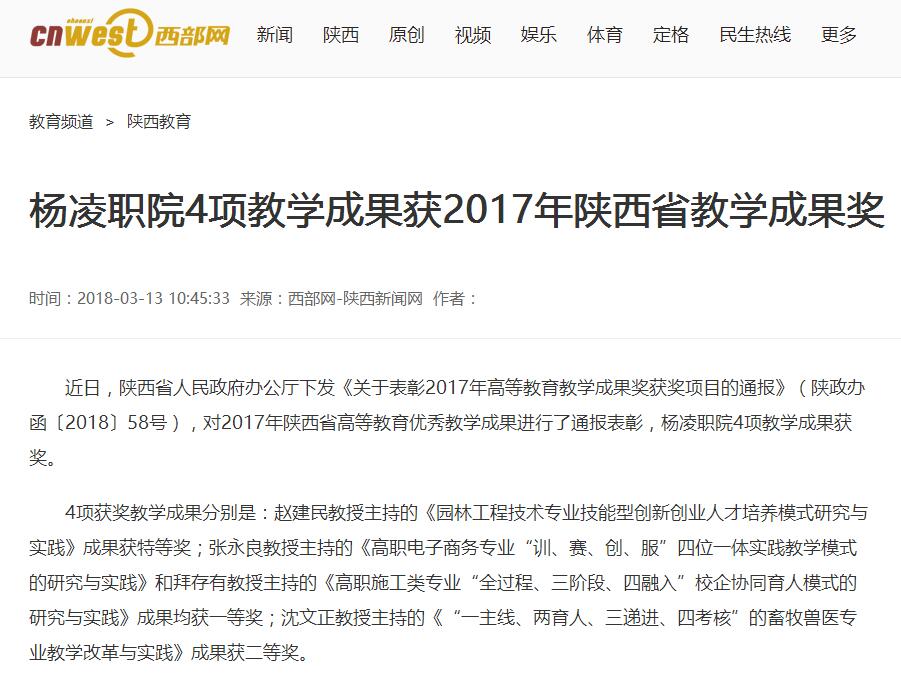 近日,陕西省人民政府办公厅下发《关于表彰2017年高等教育教学成果奖获奖项目的通报》(陕政办函〔2018〕58号),对2017年陕西省高等教育优秀教学成果进行了通报表彰,杨凌职院4项教学成果获奖。