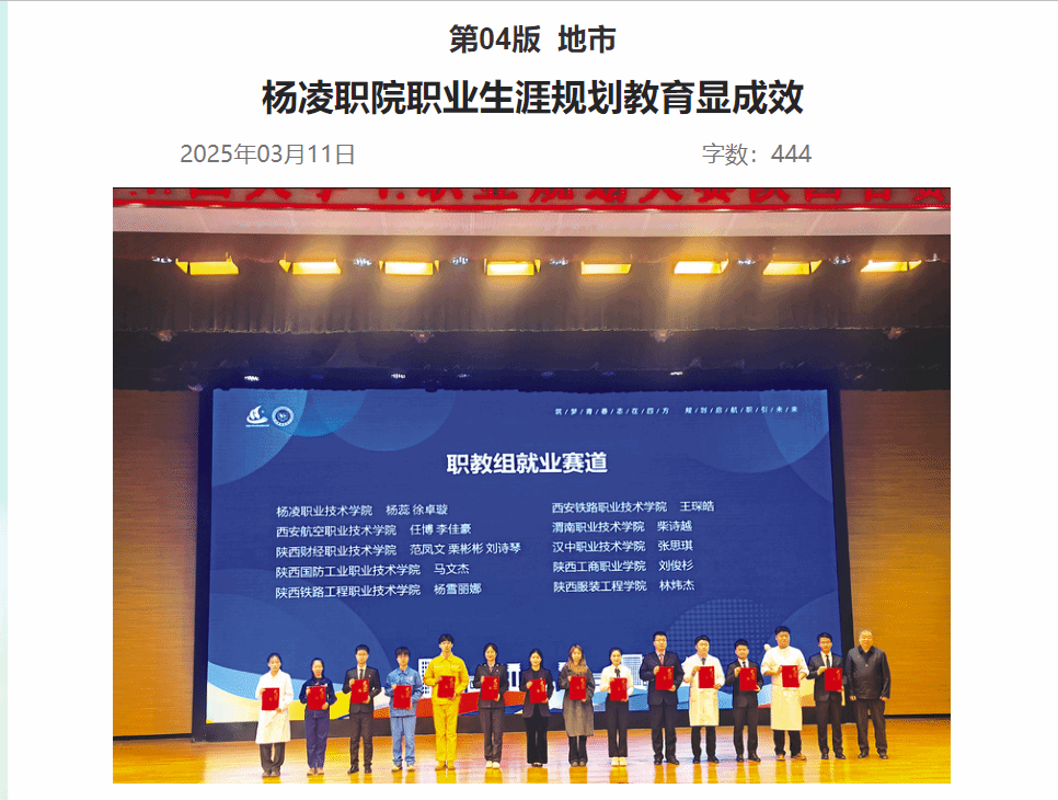 本次大赛以“筑梦青春志在四方,规划启航职引未来”为主题。经过激烈角逐,杨凌职院生态环境工程学院学生刘昱彤获职教组成长赛道金奖,动物工程学院学生赵徵麒、交通与测绘工程学院学生侯森获职教组成长赛道银奖;药物与化工学院学生杨蕊、交通与测绘工程学院学生徐卓璇获职教组就业赛道金奖,建筑工程学院学生时健获职教组就业赛道银奖。