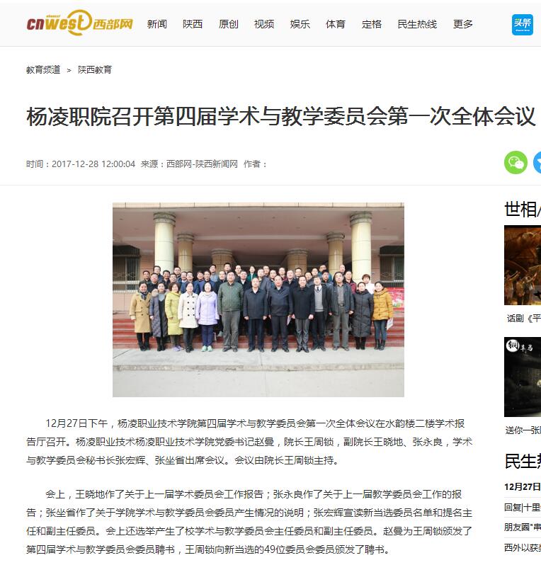 今年9月,杨凌职业技术学院起草修订了《杨凌职业技术杨凌职业技术学院学术与教学委员会章程》,10月启动了院学术与教学委员会换届工作。在第一次全体委员会议上,院长王周锁当选新一届学术与教学委员会主任委员,副院长王晓地、张永良当选为新一届学术与教学委员会副主任委员。