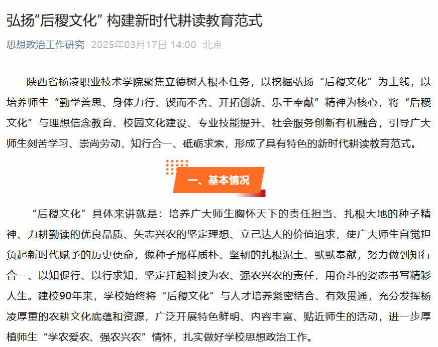 陕西省杨凌职业技术学院聚焦立德树人根本任务,以挖掘弘扬“后稷文化”为主线,以培养师生“勤学善思、身体力行、锲而不舍、开拓创新、乐于奉献”精神为核心,将“后稷文化”与理想信念教育、校园文化建设、专业技能提升、社会服务创新有机融合,引导广大师生刻苦学习、崇尚劳动,知行合一、砥砺求索,形成了具有特色的新时代耕读教育范式。