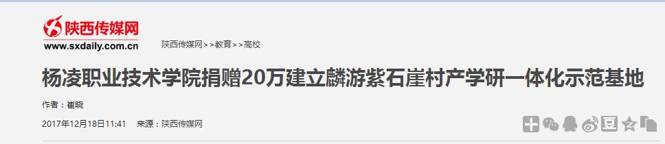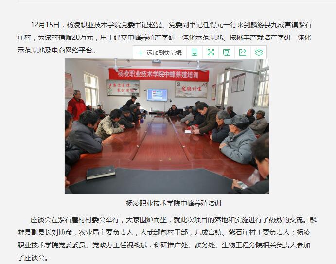12月15日,杨凌职业技术学院党委书记赵曼、党委副书记任得元一行来到麟游县九成宫镇紫石崖村,为该村捐赠20万元,用于建立中蜂养殖产学研一体化示范基地、核桃丰产栽培产学研一体化示范基地及电商网络平台。
