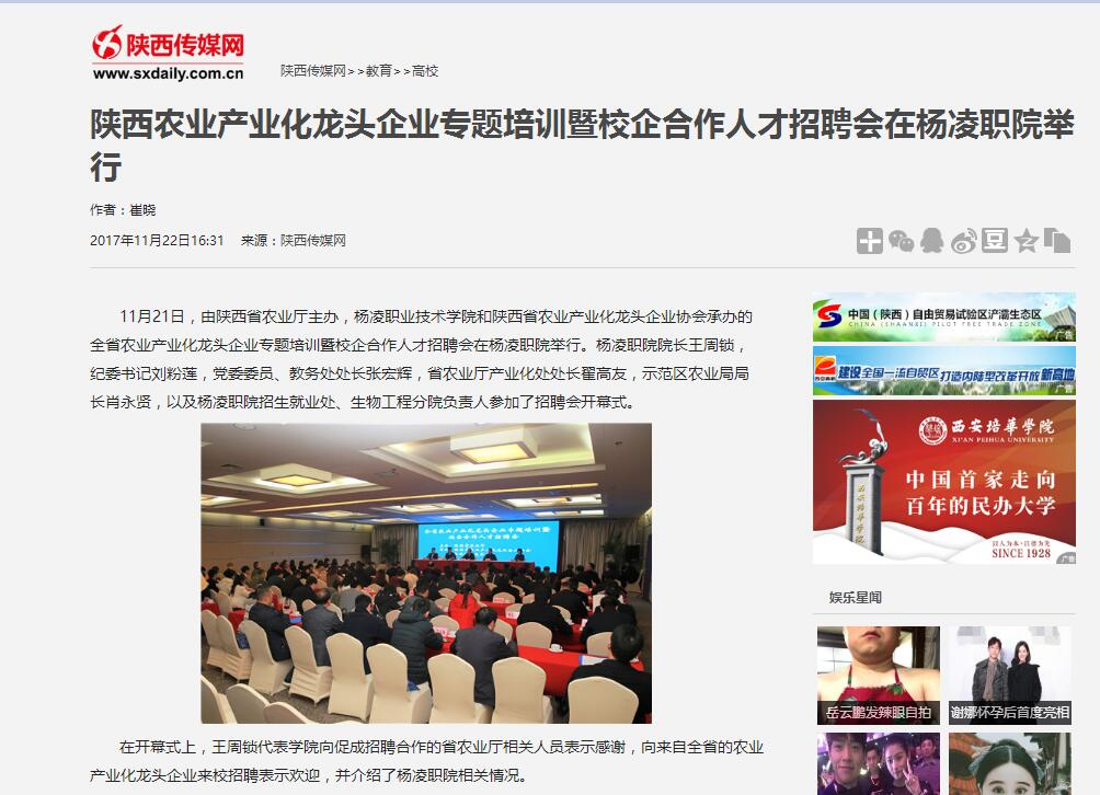 11月21日,由陕西省农业厅主办,杨凌职业技术学院和陕西省农业产业化龙头企业协会承办的全省农业产业化龙头企业专题培训暨校企合作人才招聘会在杨凌职院举行。杨凌职院院长王周锁,纪委书记刘粉莲,党委委员、教务处处长张宏辉,省农业厅产业化处处长翟高友,示范区农业局局长肖永贤,以及杨凌职院招生就业处、生物工程分院负责人参加了招聘会开幕式。
