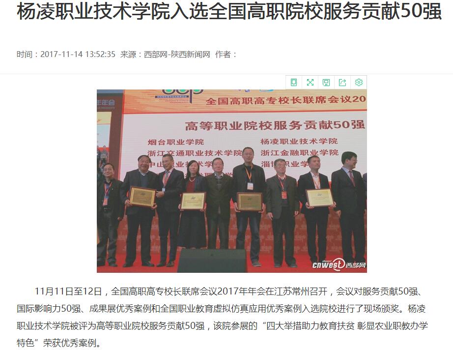【西部网】杨凌职业技术学院入选全国高职院校服务贡献50强