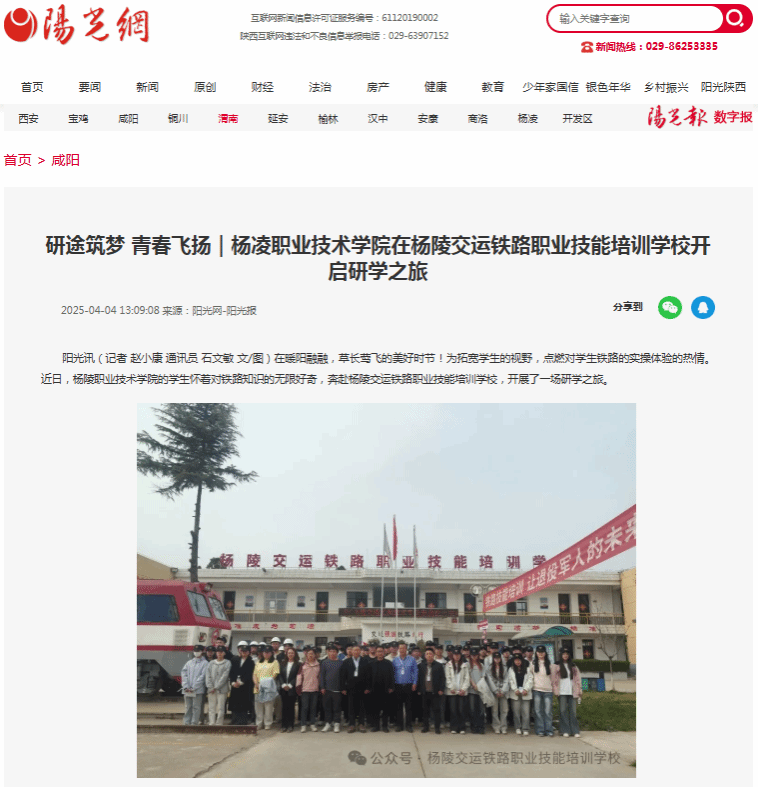 阳光讯(记者 赵小康 通讯员 石文敏 文/图)在暖阳融融,草长莺飞的美好时节!为拓宽学生的视野,点燃对学生铁路的实操体验的热情。近日,杨陵职业技术学院的学生怀着对铁路知识的无限好奇,奔赴杨陵交运铁路职业技能培训学校,开展了一场研学之旅。