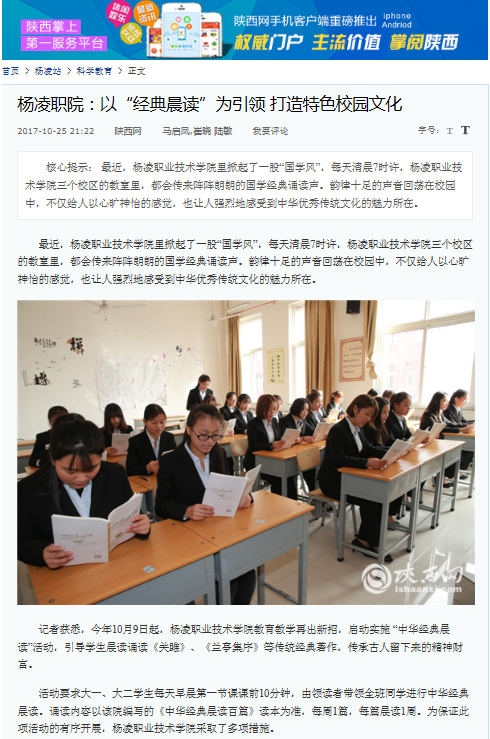 记者获悉,今年10月9日起,杨凌职业技术学院教育教学再出新招,启动实施 “中华经典晨读”活动,引导学生晨读诵读《关雎》、《兰亭集序》等传统经典著作,传承古人留下来的精神财富。