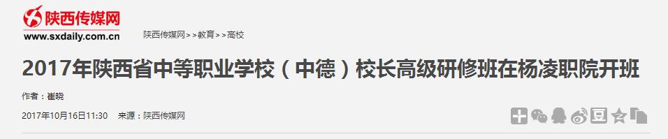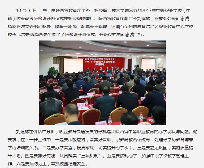 10 月15 日 上午,由陕西省教育厅主办,杨凌职业技术学院承办的2017年中等职业学校(中德)校长高级研修班开班仪式在杨凌职院举行。陕西省教育厅副厅长刘建林、职成处处长韩忠诚,杨凌职院党委书记赵曼、院长王周锁、副院长王晓地,德国石荷州首府基尔地区职业教育中心学校校长武尔夫·魏泽西先生参加了研修班开班仪式。开班仪式由韩忠诚主持。