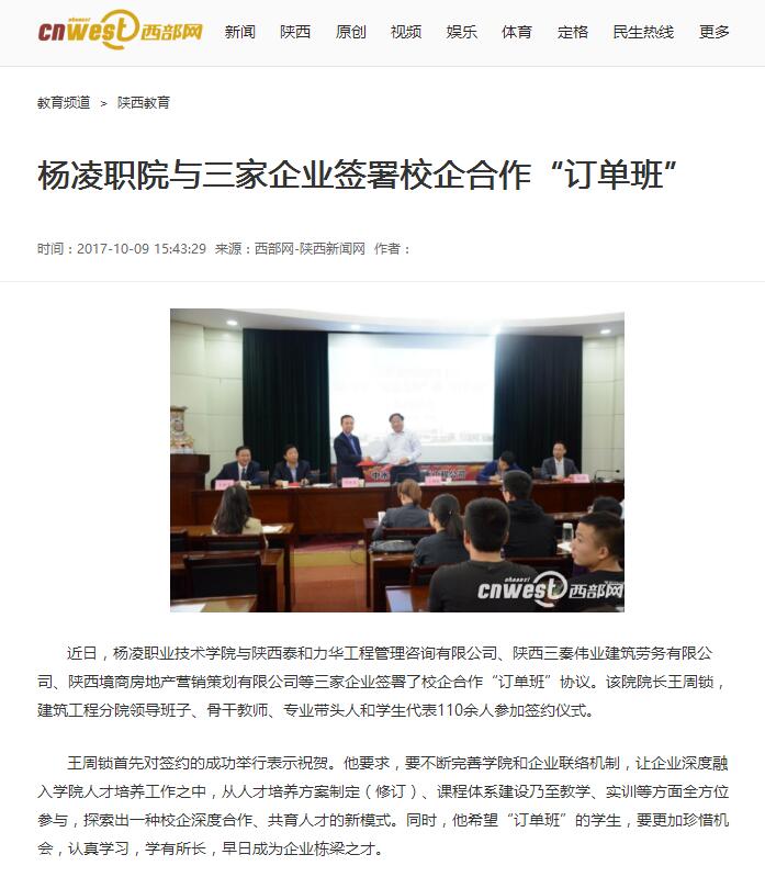 【西部网】杨凌职院与三家企业签署校企合作“订单班”