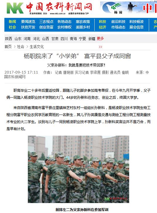 来自陕西省渭南市富平县庄里镇神芝村东村一组组长孙新科,是杨凌职业技术学院生物工程分院富平职业农民学历教育班的一名新生,其儿子孙英康是交通与测绘工程分院工程测量技术专业的大二学生。谈到与儿子一同到杨凌职业技术学院上学,孙新科笑言这并不是巧合,而是早有计划。