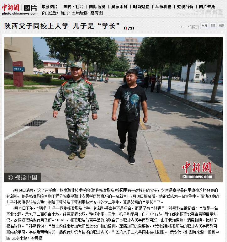 陕西父子同校上大学 儿子是“学长” 9月14日消息,这个开学季,杨凌职业技术学院(简称杨凌职院)校园里有一对特殊的父子,父亲是富平县庄里镇神芝村44岁的孙新科,他是杨凌职院生物工程分院富平职业农民学历教育班的一名新生,9月10日报名后,他正式成为一名大学生。而他21岁的儿子孙英康是该院交通与测绘工程分院工程测量技术专业的大二学生,算是父亲的“学长”了。