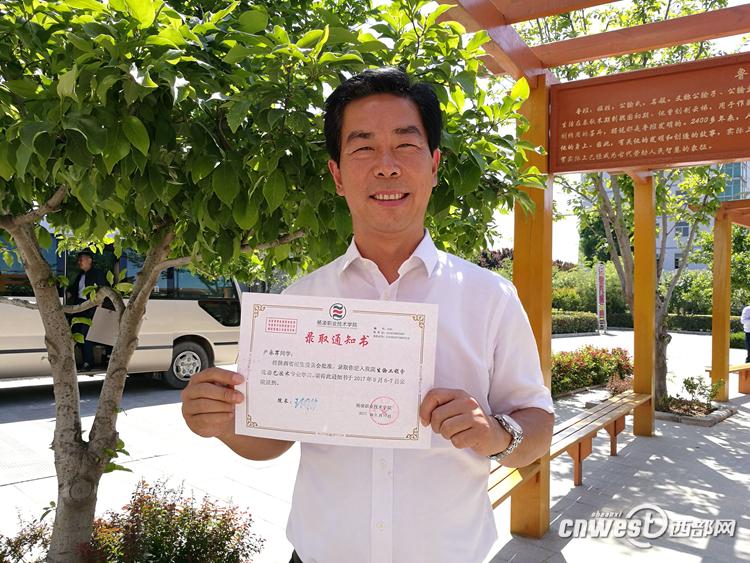 5月16号下午,来自眉县横渠镇万家塬村的45岁农民严永军和其54位农民一起获得了由杨凌职业技术学院颁发的大学录取通知书,这让他激动不已,严永军还有一个身份那就是万家塬村党支部书记,他告诉记者,曾错失大学教育机会的他,今年3月参加了杨凌职业技术学院的自主招生考试,被成功录取,成为杨凌职业技术学院生物工程分院园艺技术专业的一名学生,9月他就将走入大学校园,围绕猕猴桃种植储存技术、现代农业经营、乡村旅游等方面进行学习。