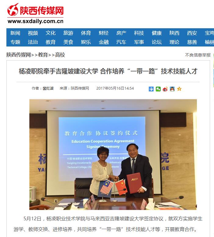 5月12日,杨凌职业技术学院与马来西亚吉隆坡建设大学签定协议,就双方实施学生游学、教师交换、进修培养,共同培养“一带一路”技术技能人才等,开展教育合作。