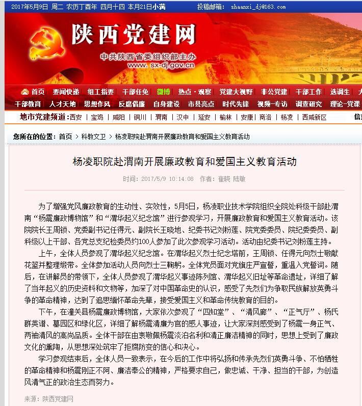 为了增强党风廉政教育的生动性、实效性,5月5日,杨凌职业技术学院组织全院处科级干部赴渭南“杨震廉政博物馆”和“渭华起义纪念馆”进行参观学习,开展廉政教育和爱国主义教育活动。该院院长王周锁、党委副书记任得元、副院长王晓地、纪委书记刘粉莲、院党委委员、院纪委委员、副科级以上干部、各党总支纪检委员约100人参加了此次参观学习活动。活动由纪委书记刘粉莲主持。