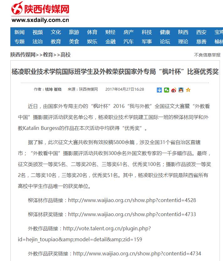 近日,由国家外专局主办的“枫叶杯”2016“我与外教”全国征文大赛暨“外教看中国”摄影展评活动获奖名单公布,杨凌职业技术学院建工国际一班的柳泽林同学和外教Katalin Burgess的作品在本次活动中均获得“优秀奖”。